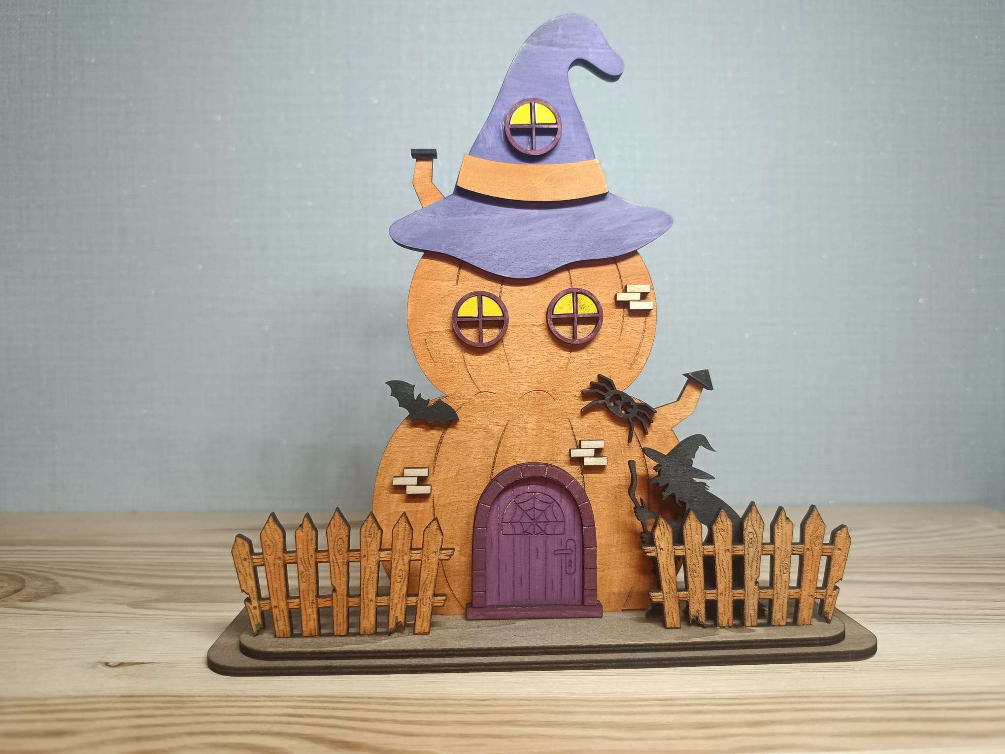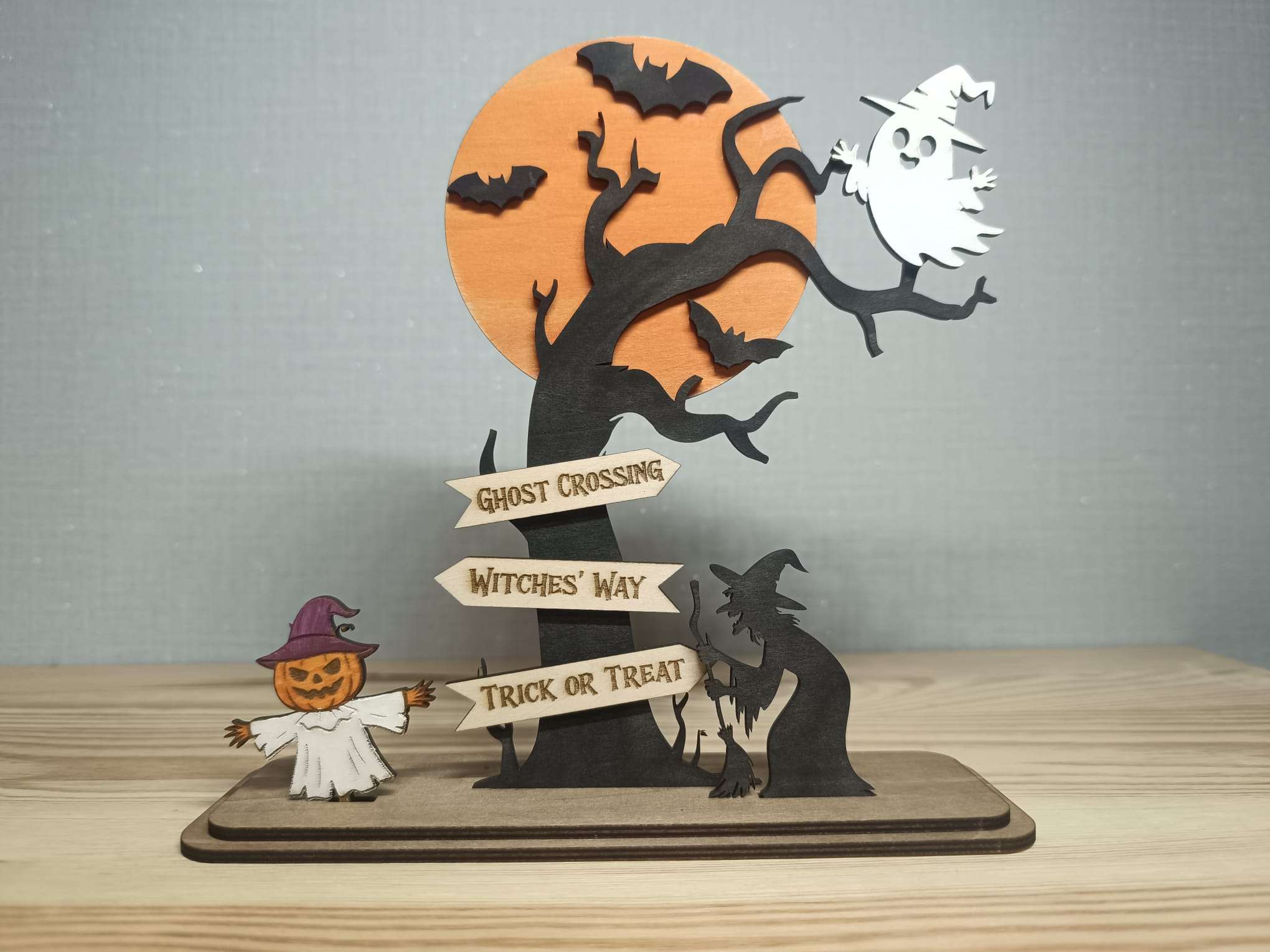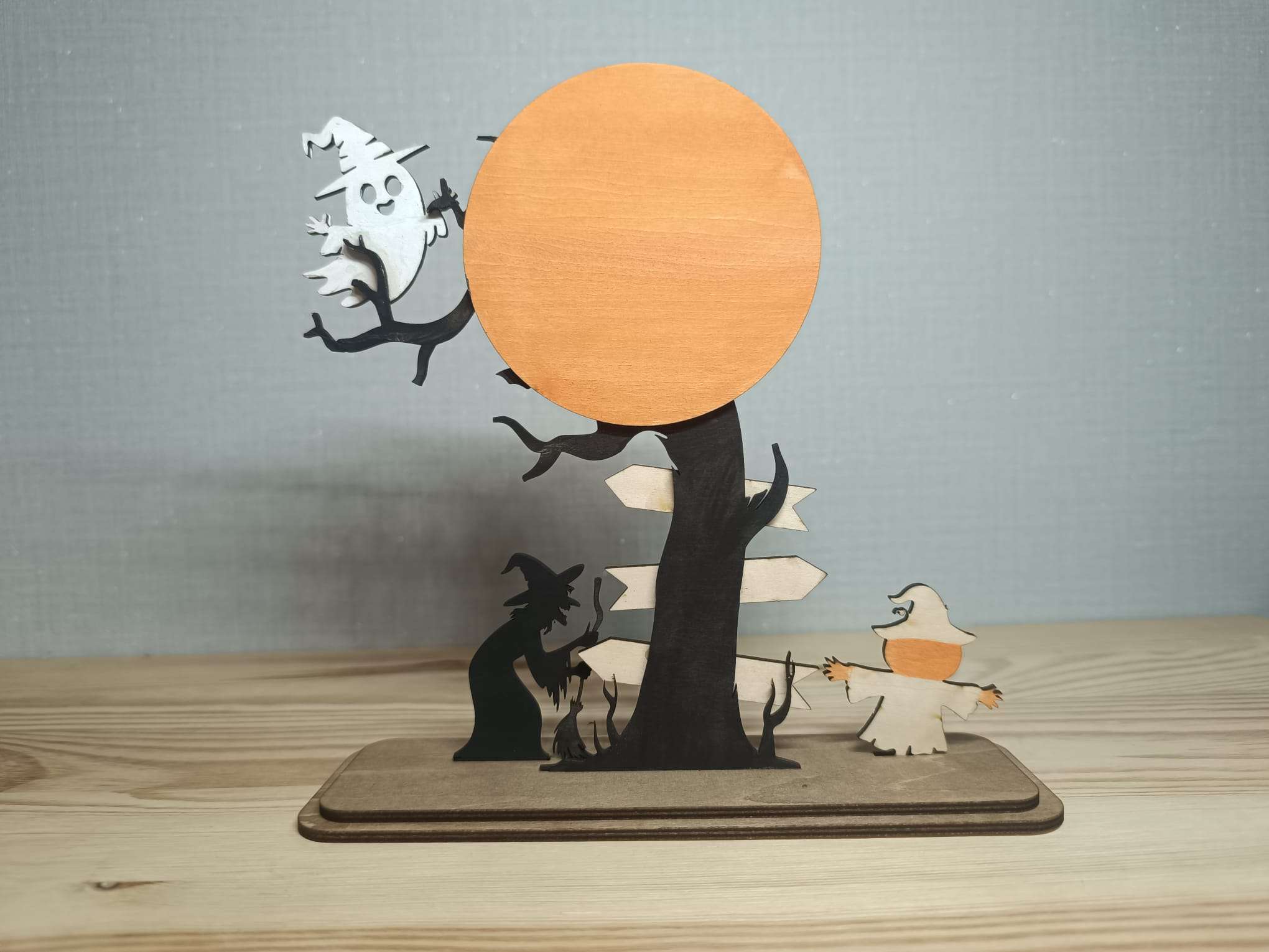 Apportez une touche originale et chaleureuse à votre décoration d’Halloween avec ces créations en contreplaqué de tilleul, montées sur un socle peint au brou de noix et mises en couleur à la peinture acrylique.