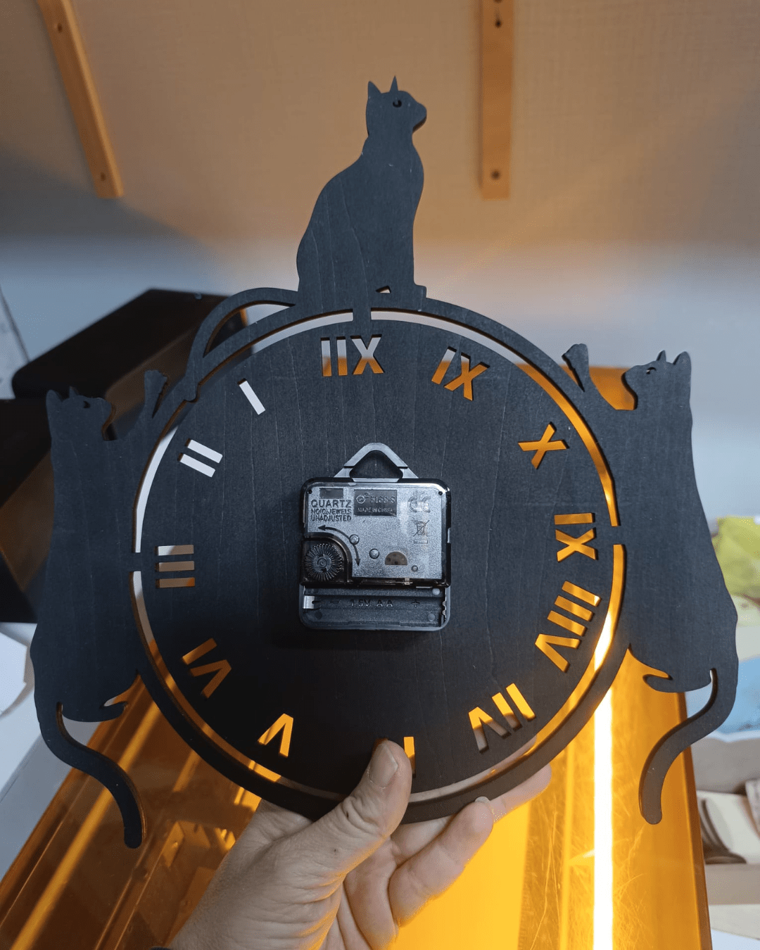 Fabriquée en contreplaqué de tilleul, puis peinte en noir, cette horloge joue sur les contrastes grâce à ses découpes fines et son mécanisme couleur laiton, pour un rendu à la fois moderne et chaleureux.